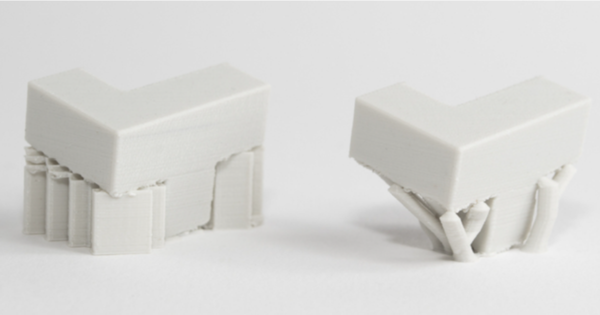 Exemples d'objets 3D avant et après retrait des supports d'impression