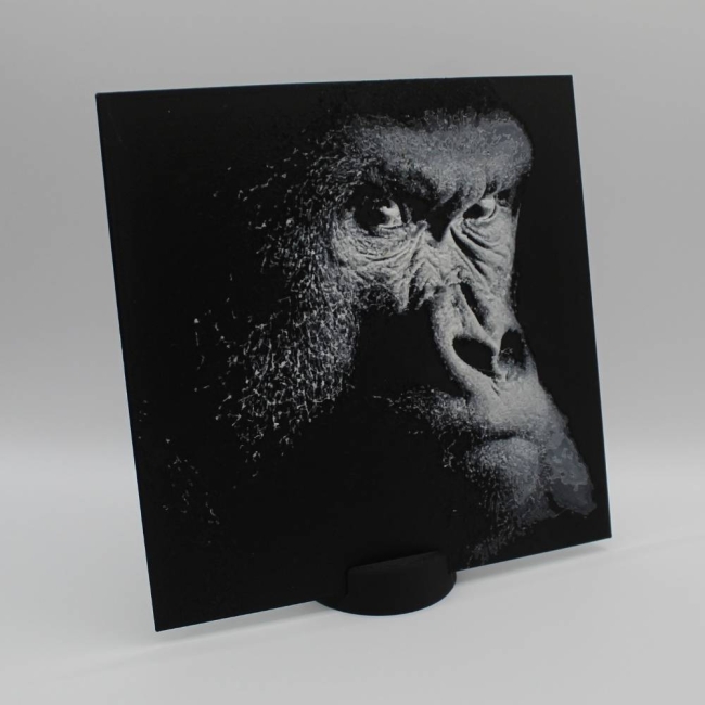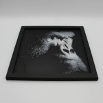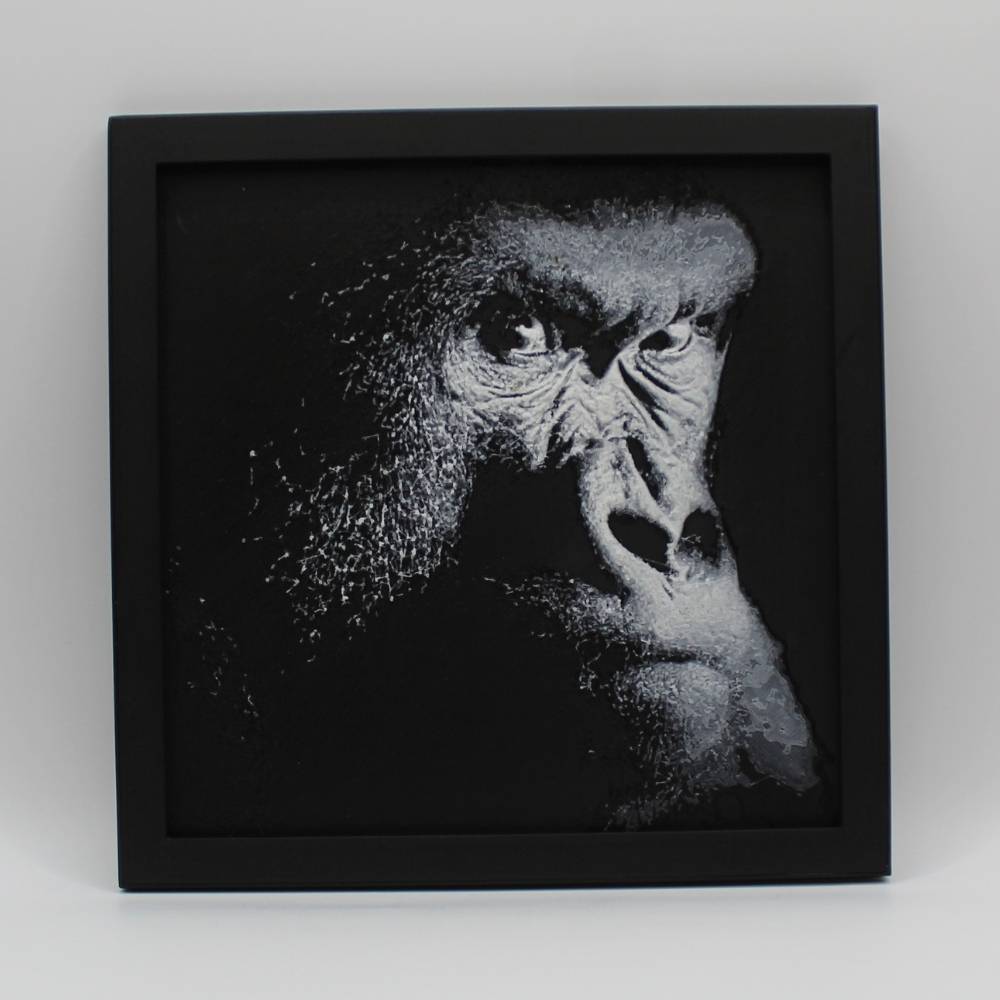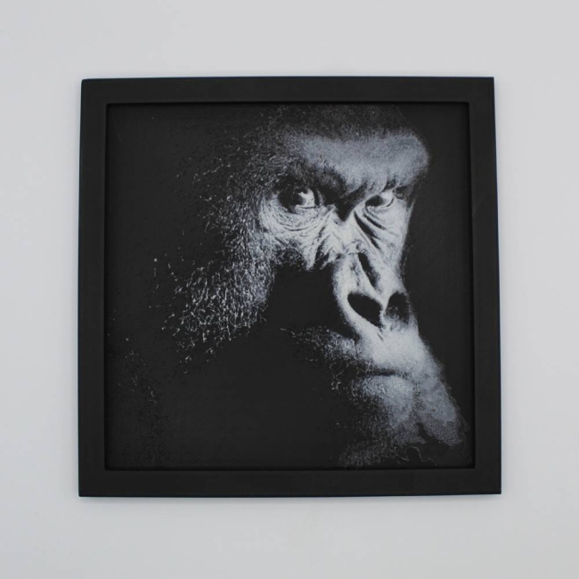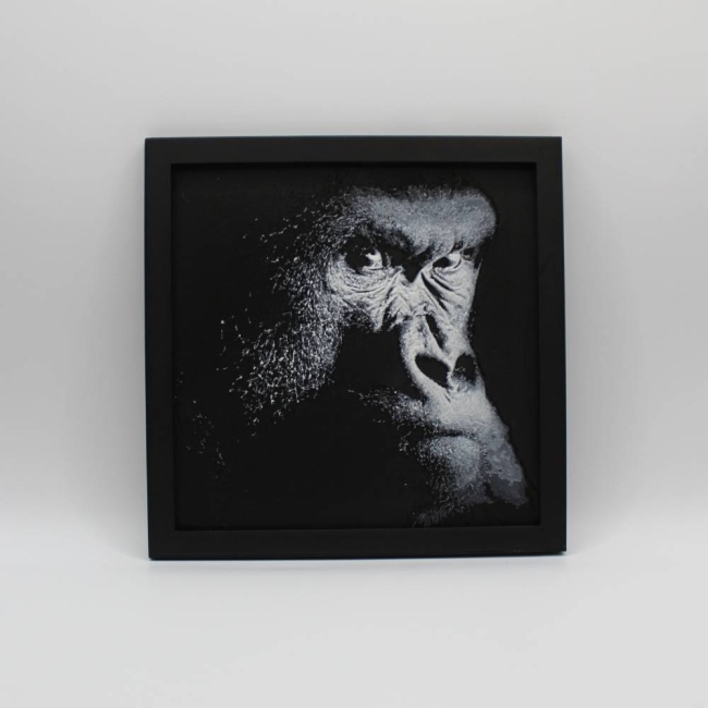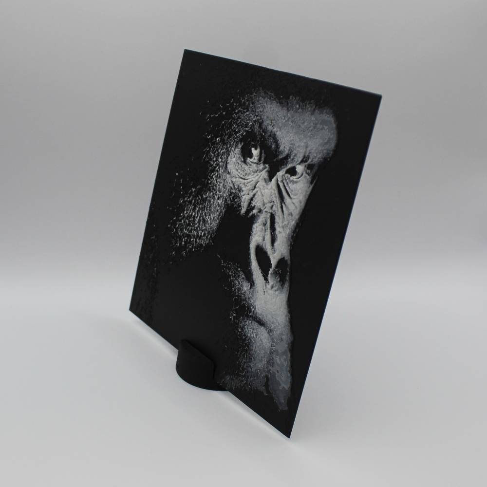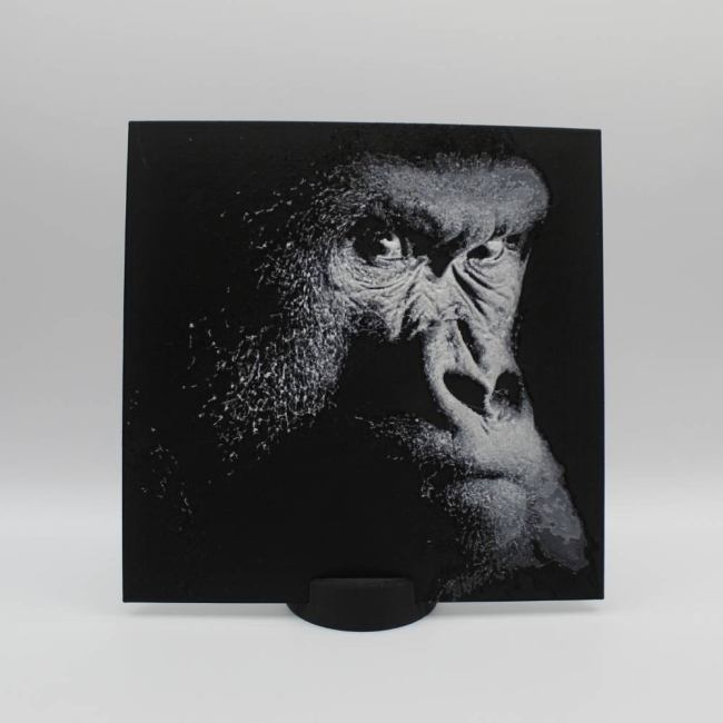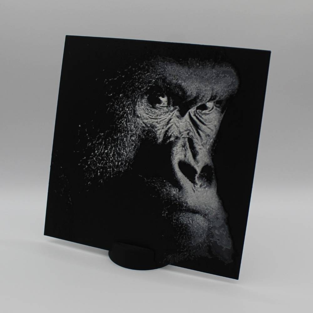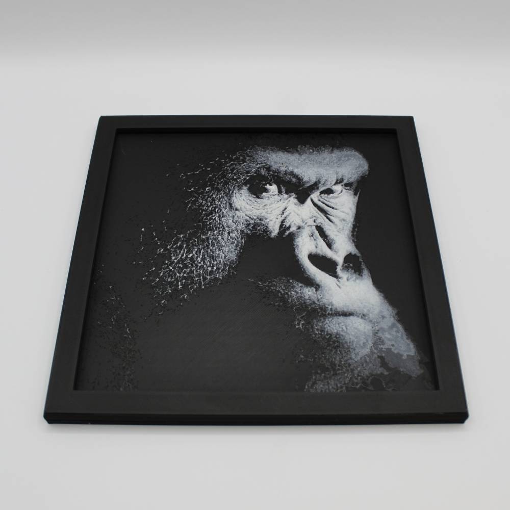 Plonge dans l’intensité du regard du gorille avec cette photo 3D imprimée en relief. Chaque détail de son visage est sublimé par le jeu d’ombres et de lumière, offrant un effet de profondeur impressionnant qui capte instantanément le regard.