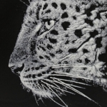 Chaque détail de sa robe tachetée et de son regard perçant est mis en valeur par le contraste du noir et du blanc, créant un effet de profondeur saisissant.