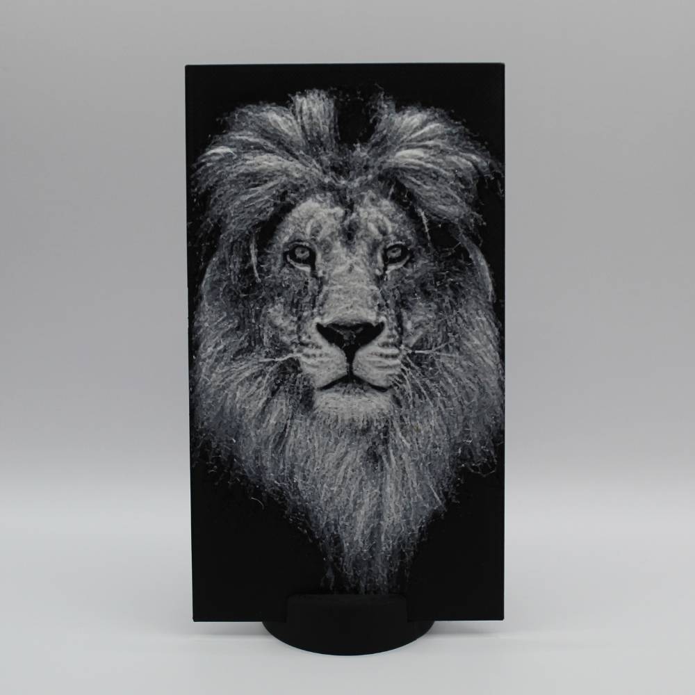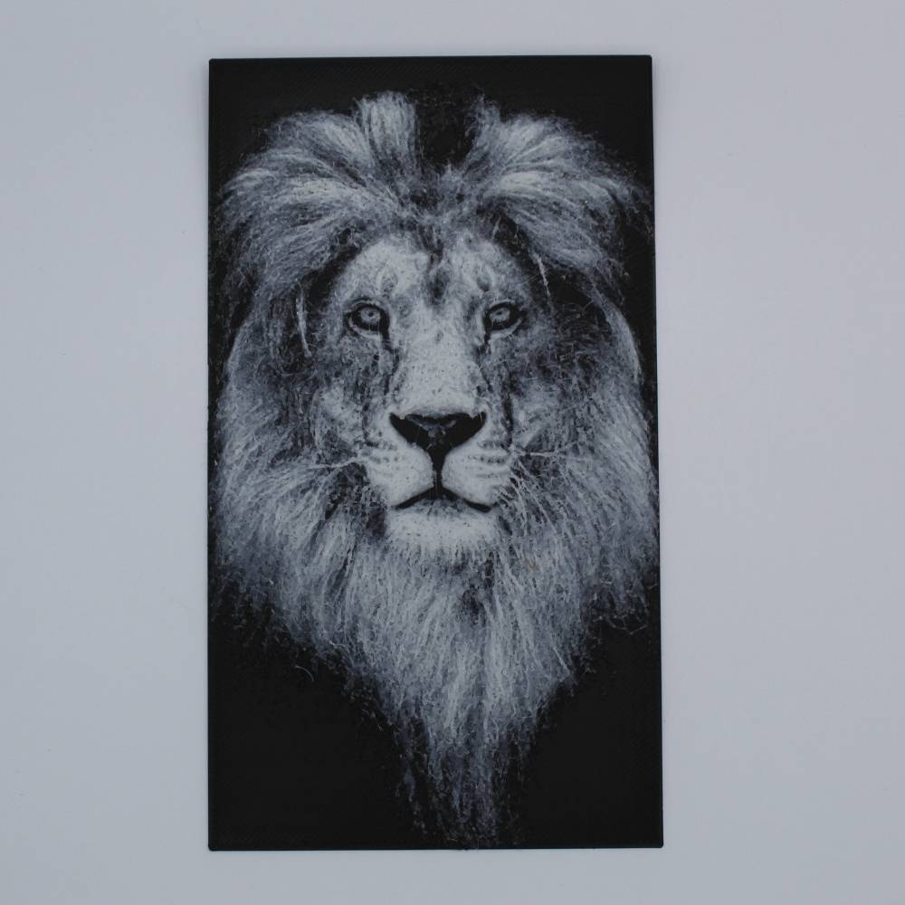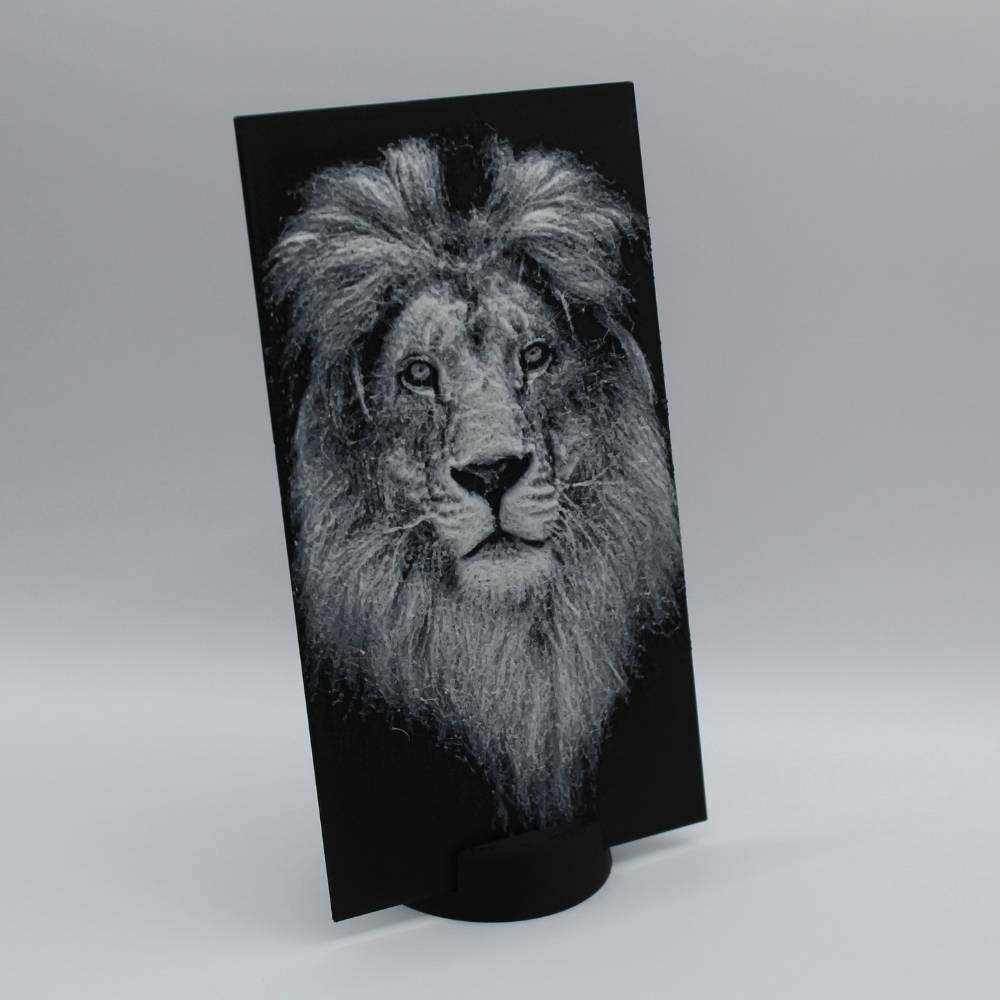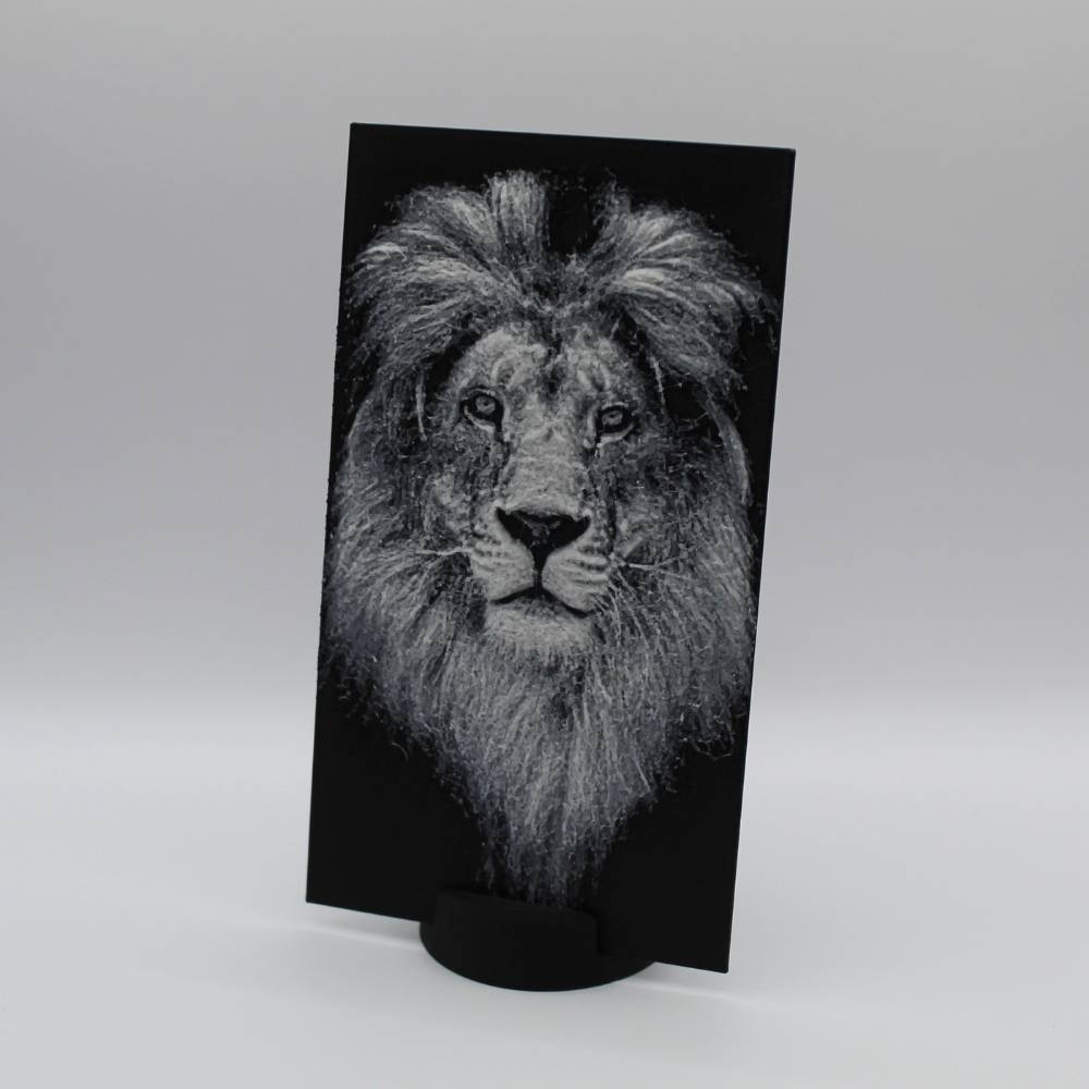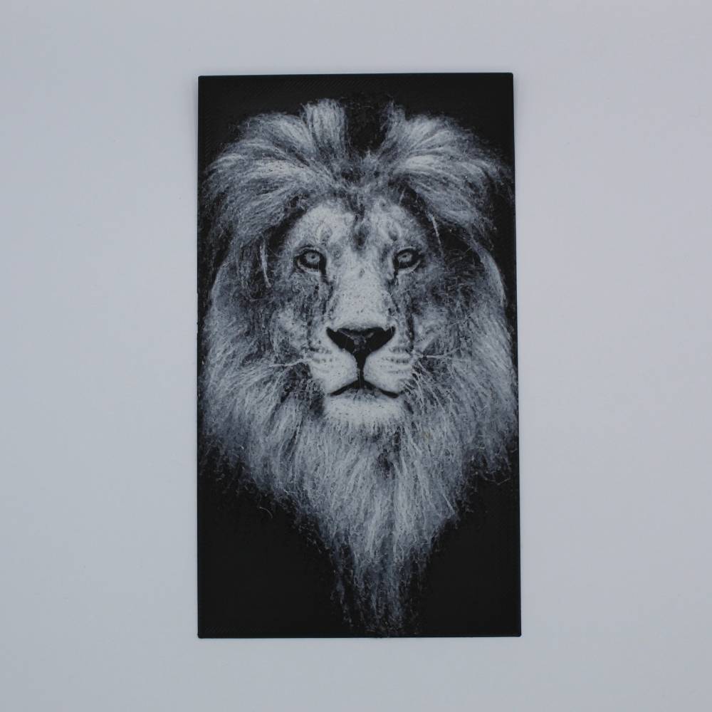 Découvre la puissance tranquille du roi de la savane à travers cette photo 3D imprimée en relief.