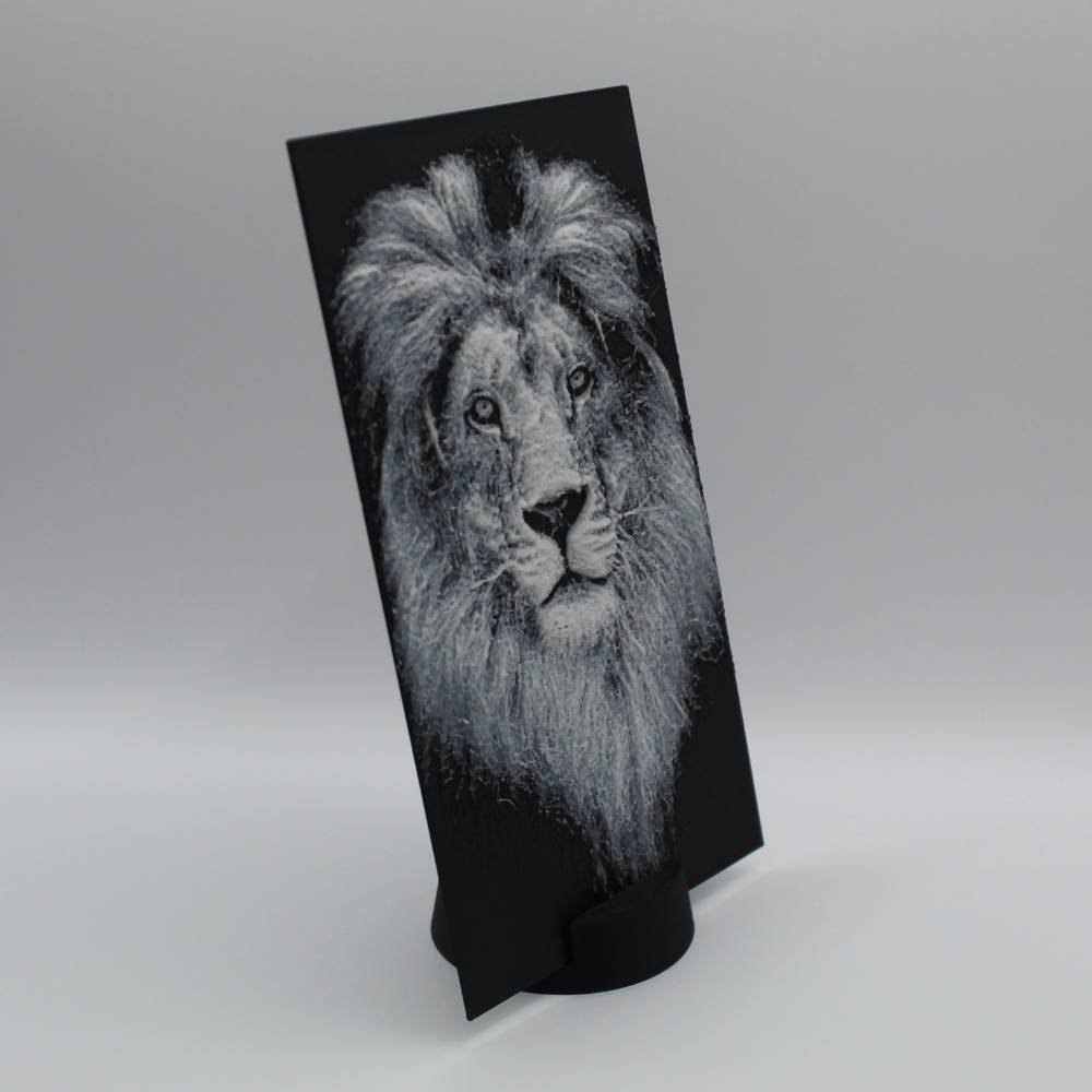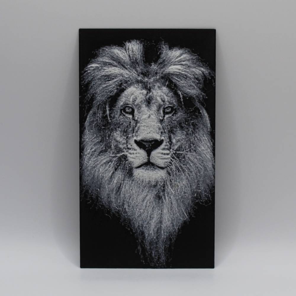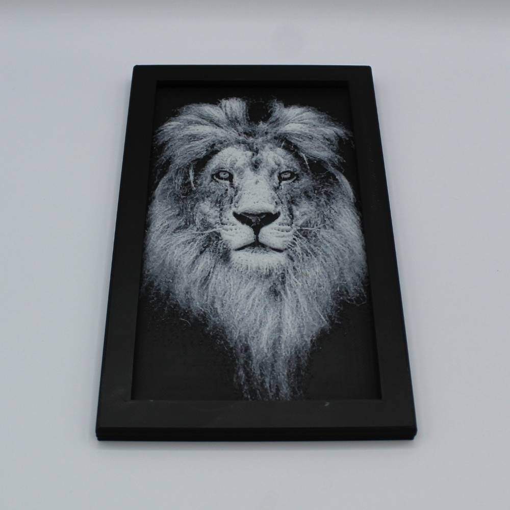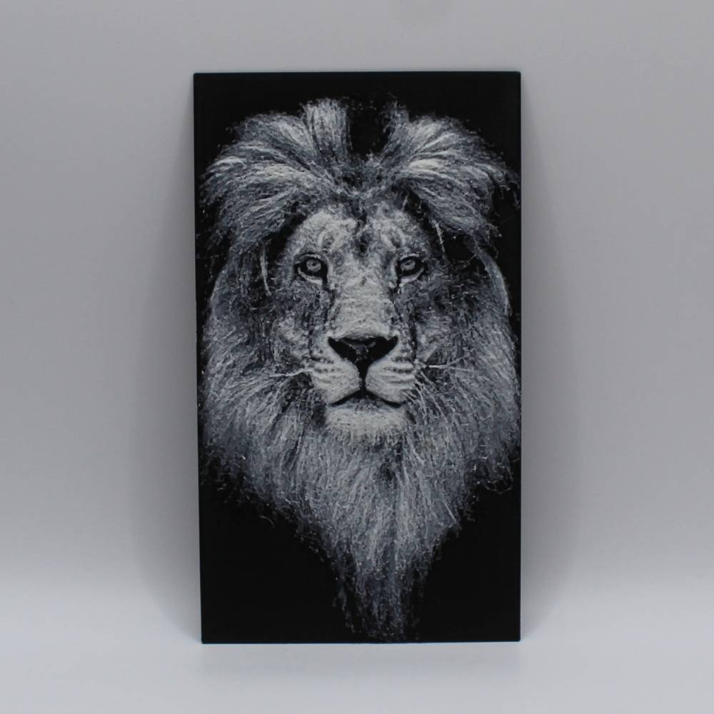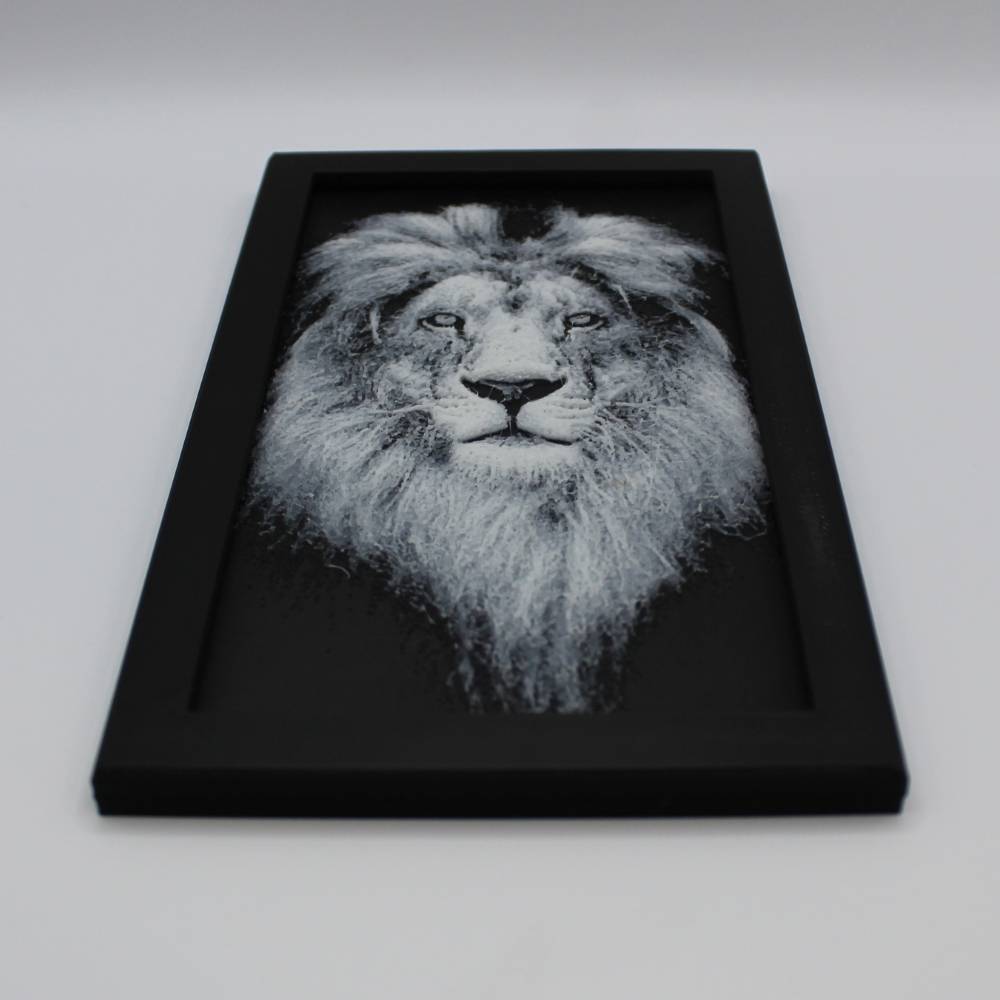 Découvre la puissance tranquille du roi de la savane à travers cette photo 3D imprimée en relief.