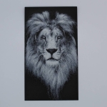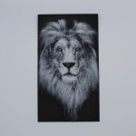 Son regard fixe et sa crinière détaillée se détachent sur un fond noir profond, créant un contraste saisissant qui met en valeur toute la noblesse du lion.