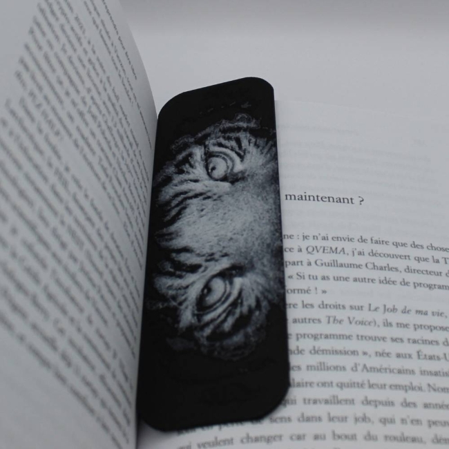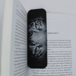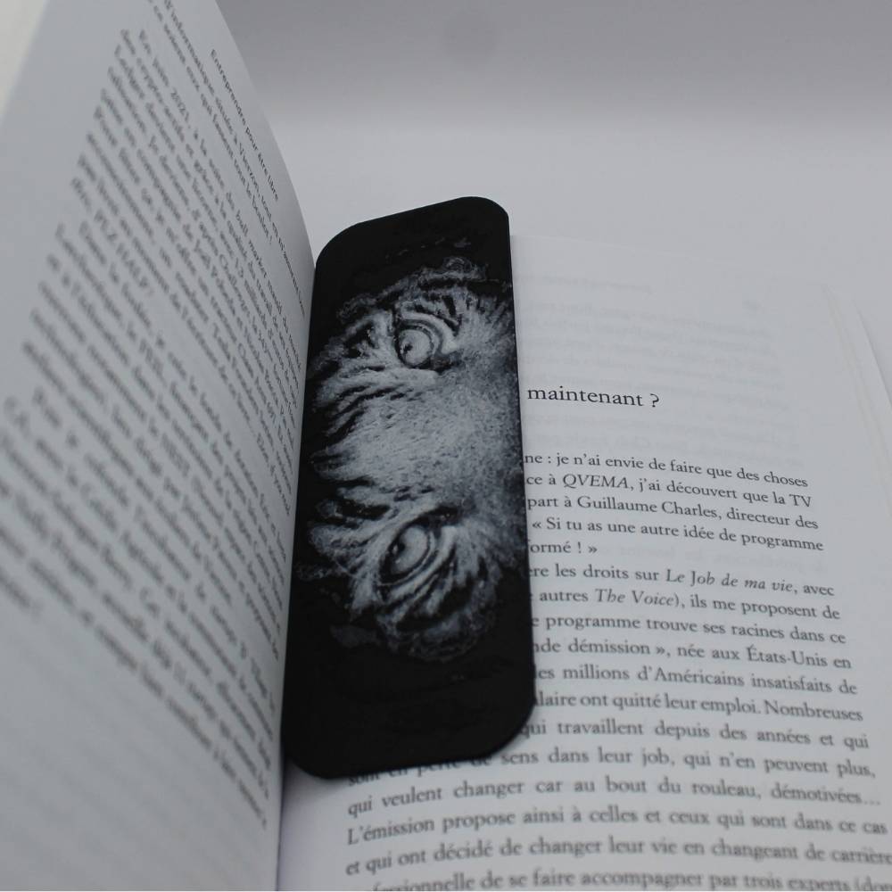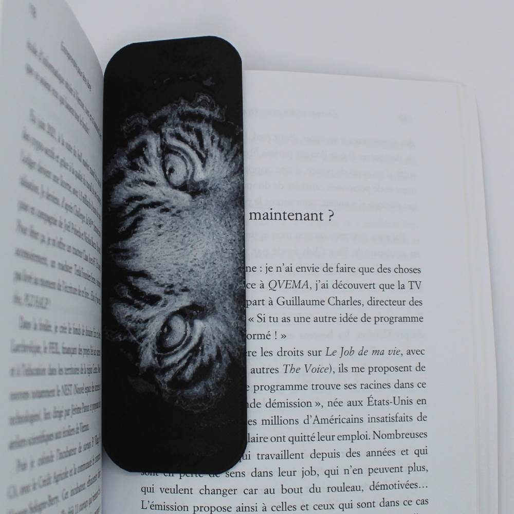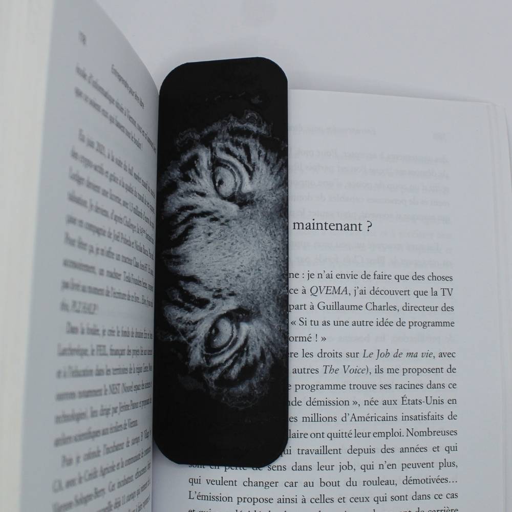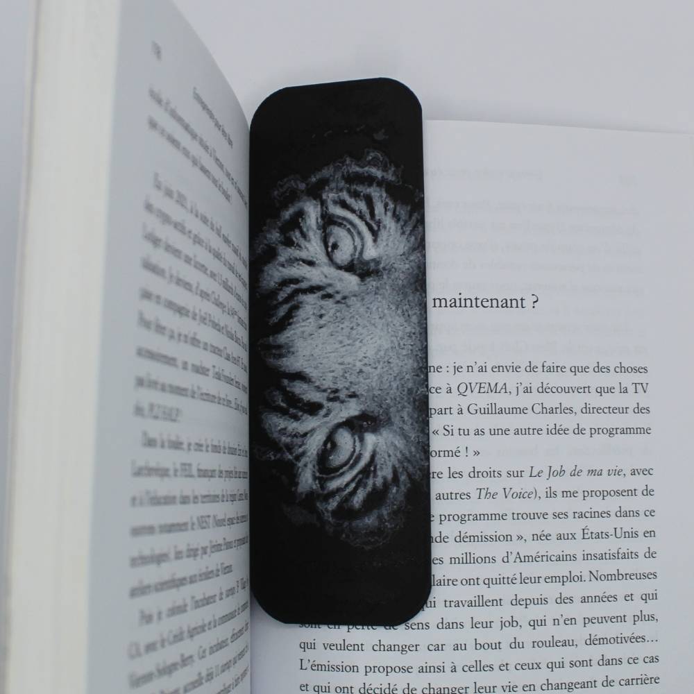 Ressens la puissance et l’intensité à chaque lecture avec ce marque-page 3D représentant les yeux d’un tigre en noir et blanc, captivants et profonds.