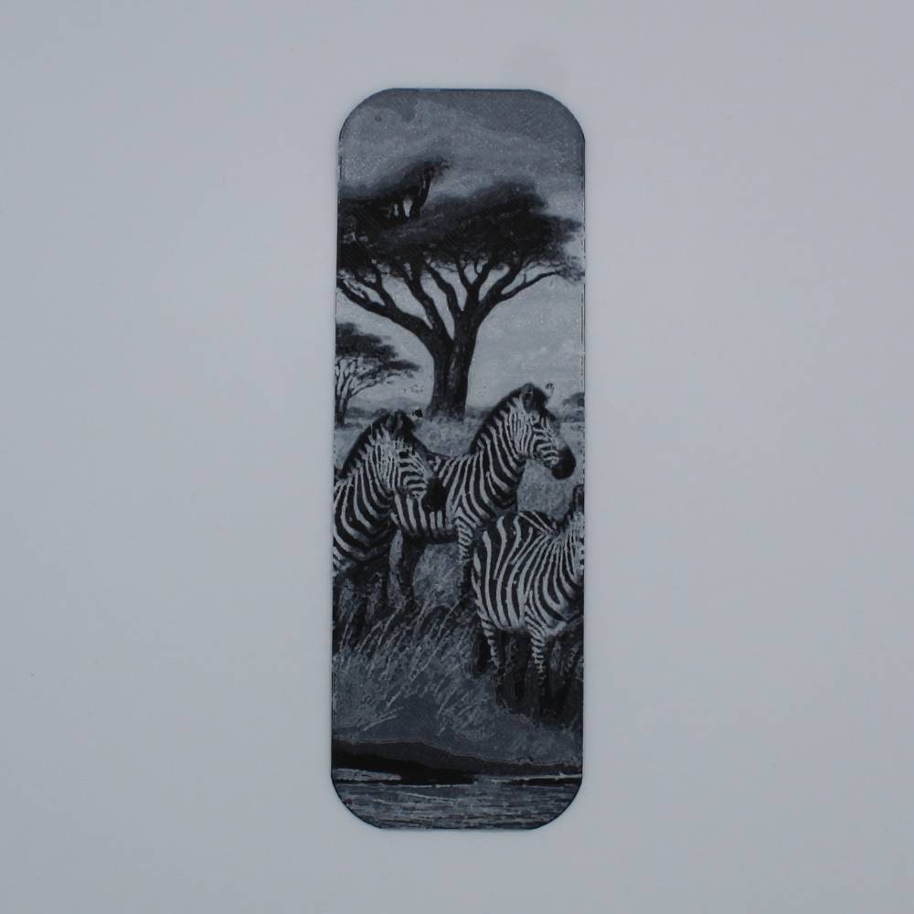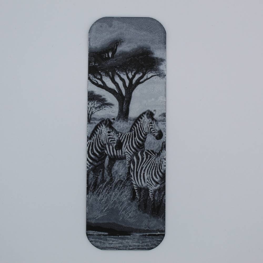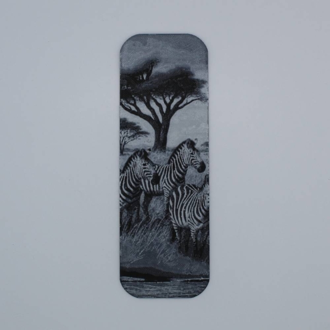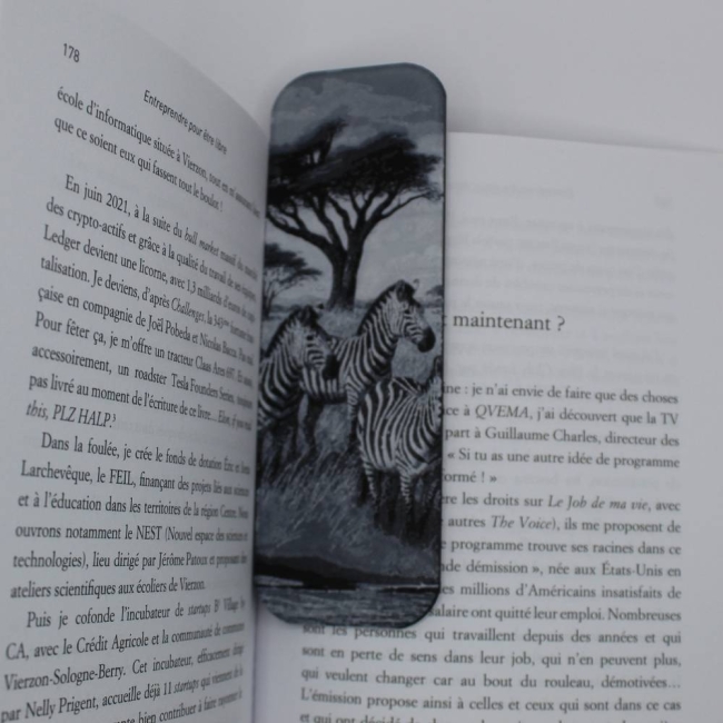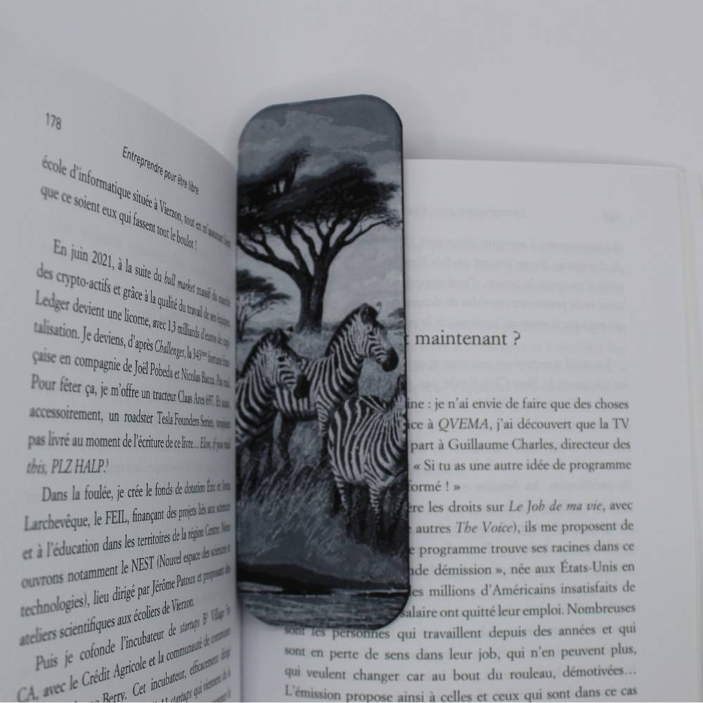 Plonge au cœur de la savane à chaque lecture avec ce marque-page 3D représentant des zèbres près d’un point d’eau, paisiblement réunis pour s’abreuver.