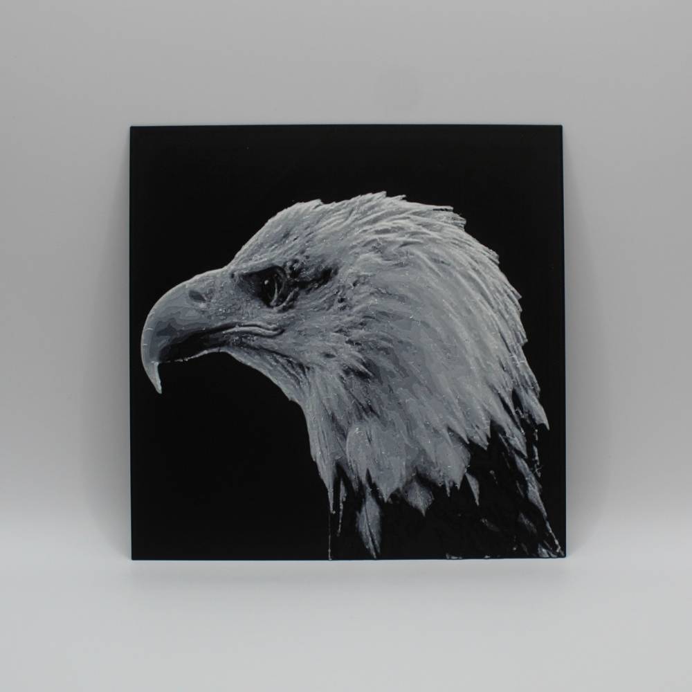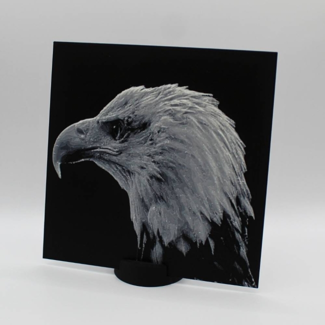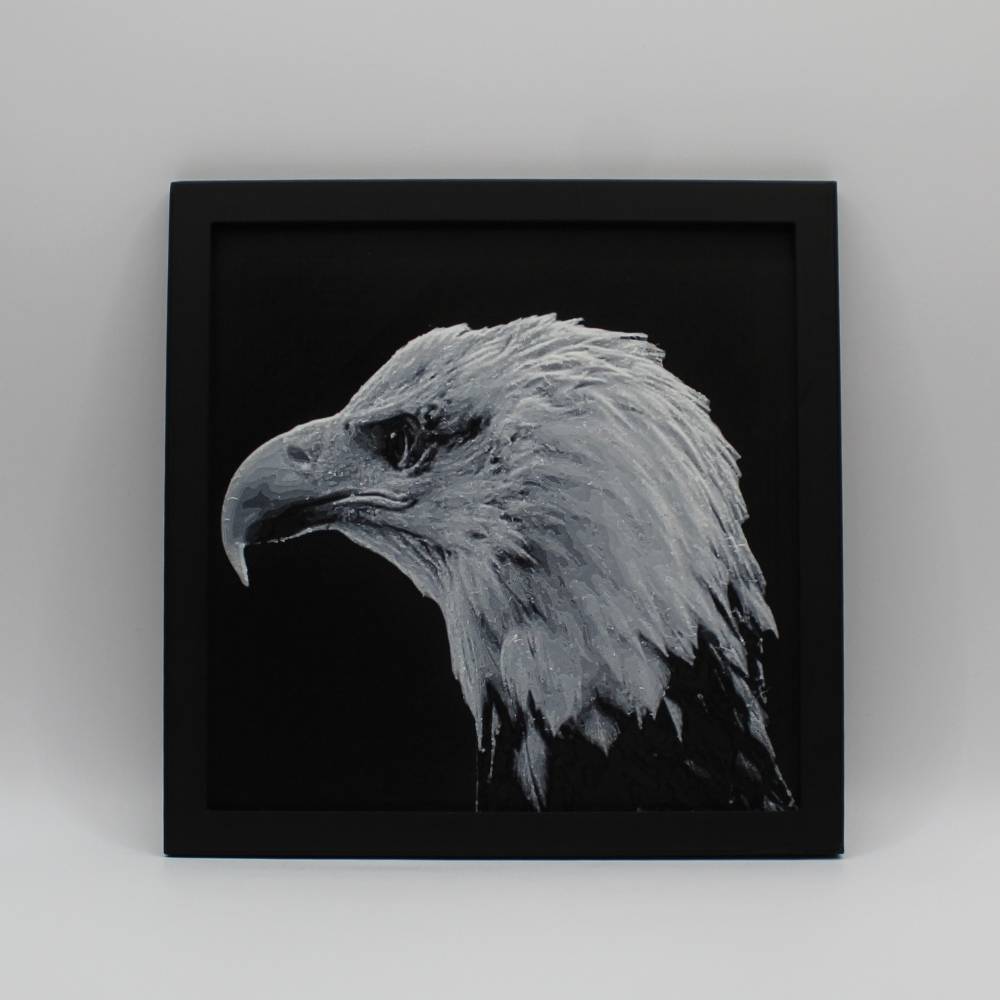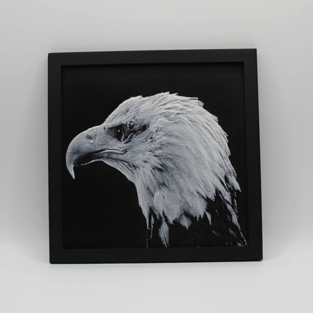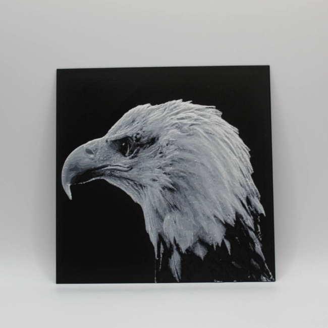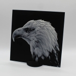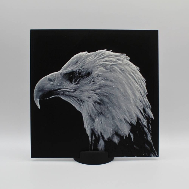 Découvre toute la prestance du pygargue à tête blanche à travers cette photo 3D imprimée en relief, qui met en valeur chaque plume et la puissance de son regard. Le rendu 3D crée un effet de profondeur saisissant qui change selon la lumière et l’angle de vue.